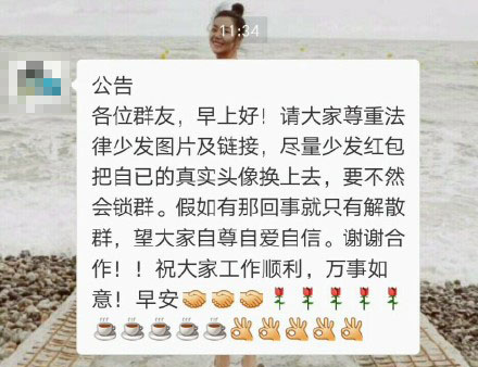 【傳聞】有桂林網(wǎng)民表示收到了一條“中國(guó)網(wǎng)絡(luò)監(jiān)控在清理整頓,要求微信群友將頭像更換為個(gè)人真實(shí)頭像,否則會(huì)被鎖群,群成員的手機(jī)號(hào)也會(huì)被控制”的消息。