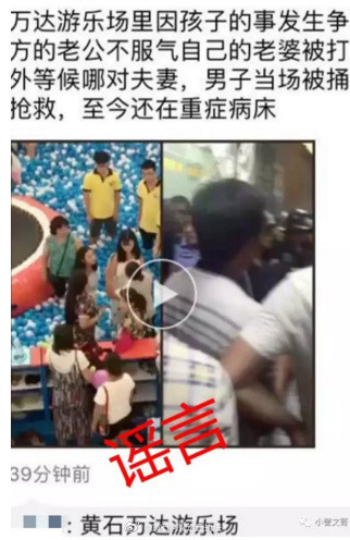 【傳聞】湖北黃石、湖南湘潭、益陽(yáng)以及山東煙臺(tái)等地傳出“在萬(wàn)達(dá)廣場(chǎng)一樓游樂場(chǎng),兩位母親因?yàn)橥尥薜氖掳l(fā)生爭(zhēng)吵,隨后,一女子老公因不服氣自己的老婆被打,叫人在萬(wàn)達(dá)外等候里面那對(duì)夫妻,男子當(dāng)場(chǎng)被捅死,女的還在搶救,至今還在重癥病床”。
