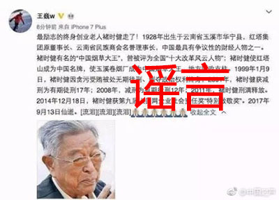 【傳聞】中國(guó)金融博物館理事長(zhǎng)王巍發(fā)布微博稱,知名企業(yè)家褚時(shí)健去世,該消息一出,引發(fā)網(wǎng)民大量轉(zhuǎn)發(fā)。