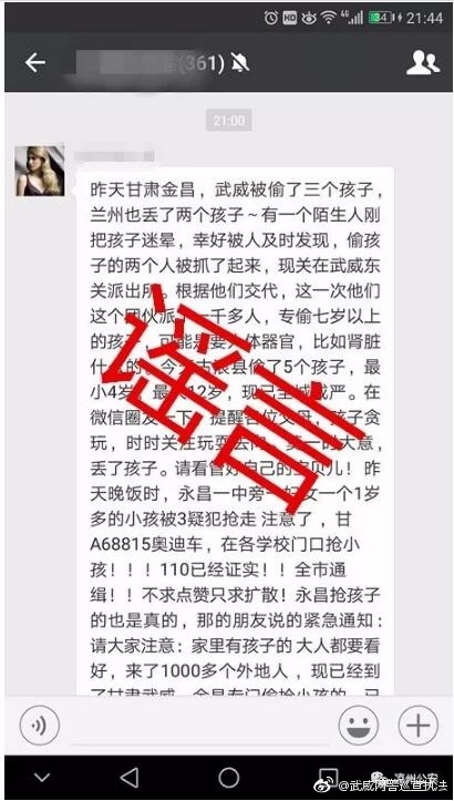 28日晚間,甘肅武威網(wǎng)警在官方微博通報(bào)了相關(guān)情況。近日,網(wǎng)警在巡查時(shí)發(fā)現(xiàn)本地朋友圈、微信群傳播一則多個(gè)小孩被偷、被搶的消息,經(jīng)核實(shí),涼州區(qū)及周邊臨縣近期未發(fā)生類似案件,也未接到有群眾報(bào)警,更沒有將搶小孩的嫌疑人關(guān)押在東關(guān)派出所的情況。此消息屬于虛假消息。警方查實(shí),網(wǎng)傳消息與之前國(guó)內(nèi)部分地市傳播的一則偷小孩謠言版本雷同,此謠言只是將外省的地名改成了武威、蘭州、金昌或是古浪等當(dāng)?shù)氐孛?/span>這類謠言的傳播,一度引發(fā)部分群眾的恐慌,嚴(yán)重干擾了社會(huì)秩序。