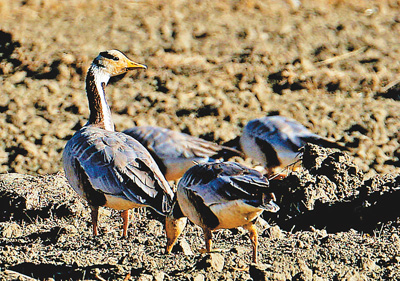 | 秋收后的青稞地里,斑頭雁在覓食。 |