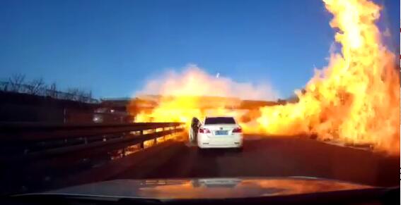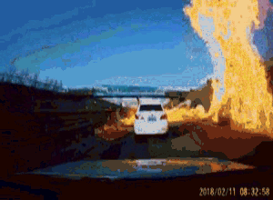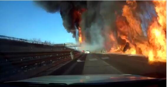 網(wǎng)傳行車記錄儀的視頻顯示,2月11日8時(shí)許,前方高速公路上有一輛油罐車側(cè)翻在地,記錄儀所在車輛停在路中,女司機(jī)說“后面(車)不倒我咋倒(車)”。此時(shí)右前方一輛小汽車往油罐車方向開了一點(diǎn),正待倒車,突發(fā)巨響,車底爆燃,一瞬即被迅速蔓延的火焰吞沒。而正前方白色小汽車司機(jī)棄車急速向后奔跑。隨即行車記錄視頻中傳來所在車中女子的尖叫哭泣聲,有男子催促倒車加油,另有女子安慰。隨著記錄儀所在車輛緊急倒退,視頻中可見高速路旁樹木綠地成片燃燒,火光沖天。倒車約30秒后,這輛車終于離開了起火范圍。