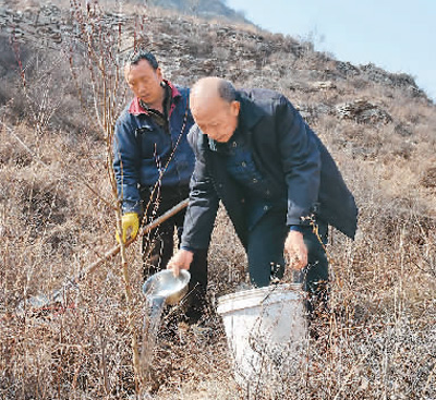 | 在河北省邢臺(tái)縣太子井鄉(xiāng)峰門村一帶的山場(chǎng),當(dāng)?shù)剞r(nóng)民給剛栽植的樹(shù)苗澆水。新華社記者 楊世堯攝 |