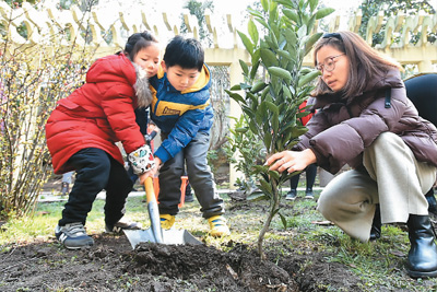 | 江蘇省揚(yáng)州市汶河街道樹(shù)人苑社區(qū)開(kāi)展“我和小樹(shù)共成長(zhǎng)”主題植樹(shù)活動(dòng),請(qǐng)小朋友和家長(zhǎng)種植果樹(shù)苗,增強(qiáng)孩子們的愛(ài)綠護(hù)綠意識(shí)。莊文斌攝(新華社發(fā)) |