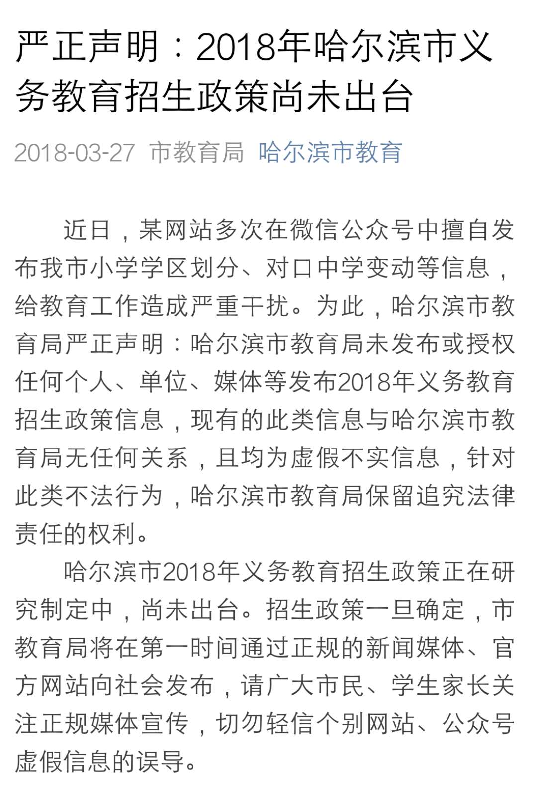 官方聲明表示,近日,某網站多次在微信公眾號中擅自發(fā)布我市小學學區(qū)劃分、對口中學變動等信息,給教育工作造成嚴重干擾。為此,哈爾濱市教育局嚴正聲明:哈爾濱市教育局未發(fā)布或授權任何個人、單位、媒體等發(fā)布2018年義務教育招生政策信息,現(xiàn)有的此類信息與哈爾濱市教育局無任何關系,且均為虛假不實信息,針對此類不法行為,哈爾濱市教育局保留追究法律責任的權利。