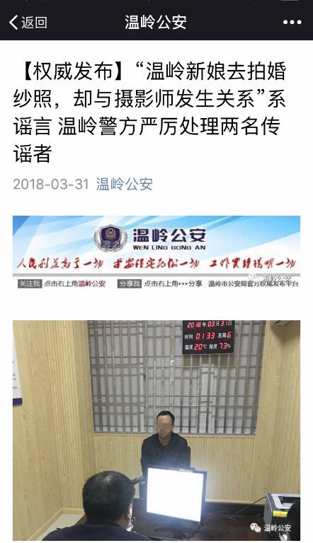 3月31日,臺(tái)州市公安局再表態(tài),網(wǎng)傳“溫嶺準(zhǔn)新娘艷照門”,真相大白,造謠者已拘留。經(jīng)查,2018年3月27日,蔡某(男,30歲,溫嶺籍)在某微信群中,為博眼球,故意捏造、散布“女的去拍婚紗照的時(shí)候,和攝影師發(fā)生關(guān)系,拍成照片后洗出來被女的老公發(fā)現(xiàn),后發(fā)到網(wǎng)上”的虛假信息。BUN安康新聞網(wǎng)