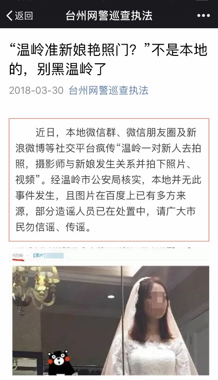 3月30日,臺(tái)州市公安局網(wǎng)警官微發(fā)布消息,所謂“溫嶺準(zhǔn)新娘艷照門”不是本地的,別黑溫嶺了。其中指出,“本地并無此事件發(fā)生”,該謠言中的“圖片在百度上已有多方來源”,并稱“部分造謠人員已在處置中”。BUN安康新聞網(wǎng)