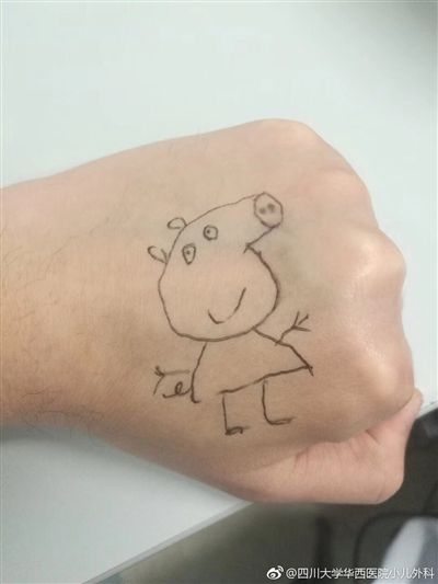 4月7日,四川大學華西醫(yī)院小兒外科官方微博“四川大學華西醫(yī)院小兒外科”發(fā)布一條微博,微博中,一位華西醫(yī)生的手上畫了一個卡通人物小豬佩奇。