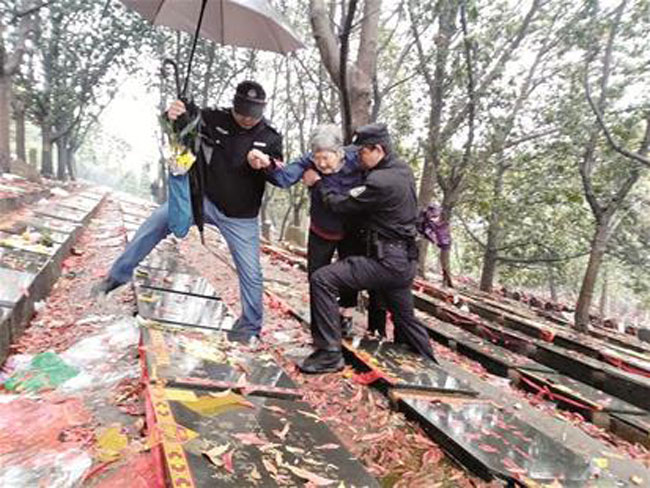 圖為民警攙扶著老人尋找墓碑