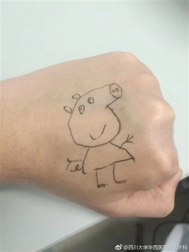 “小豬佩奇身上紋,值班用來(lái)哄病人!4月7日,四川大學(xué)華西醫(yī)院小兒外科主治醫(yī)師楊磊為了讓患者小朋友們心情愉悅,主動(dòng)在左手上畫(huà)了一只流行卡通人物小豬佩奇來(lái)“討歡心”。因?yàn)樽袷責(zé)o菌原則,小豬佩奇很快就被洗掉,但這一幕還是被網(wǎng)友點(diǎn)贊,認(rèn)為“有愛(ài)且專業(yè),感控愛(ài)心都需要!