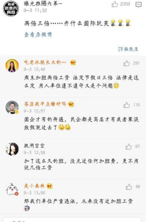 當(dāng)然,對(duì)于節(jié)假日給加班工資,網(wǎng)友也有話要說。“我們單位從來沒有給過加班工資”“兩倍、三倍,開什么國際玩笑?”“法律是這么規(guī)定的,用人單位遵不遵守又是個(gè)問題。”……看來,加不加班是個(gè)問題,能不能得到加班工資更是一個(gè)問題。