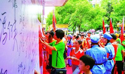 江西省遂川縣舉行“紀(jì)念抗日戰(zhàn)爭勝利七十三周年暨萬人簽名儀式”活動,教育和激勵人們銘記歷史、珍愛和平、熱愛祖國。光明圖片/視覺中國