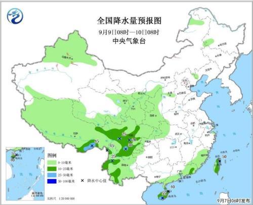 9月7日08時至8日08時,內(nèi)蒙古東北部、東北部地區(qū)中北部、新疆沿天山地區(qū)、青藏高原大部、西南地區(qū)大部、江南大部、華南和臺灣島等地有小到中雨或雷陣雨,其中,江南東南部、華南和云南中西部等地的部分地區(qū)有大雨,局地有暴雨或大暴雨(100~130毫米)(見圖1),并伴有短時強降水、雷暴大風或冰雹等強對流天氣。甘肅西北部、內(nèi)蒙古中部、華北北部、山東東部、遼寧南部等地有4~6級風。