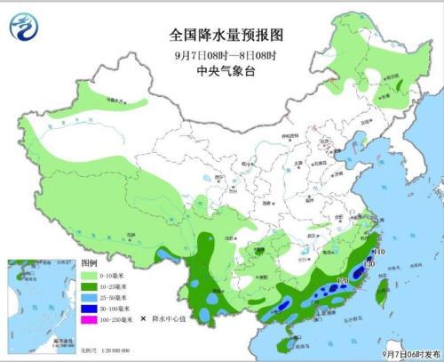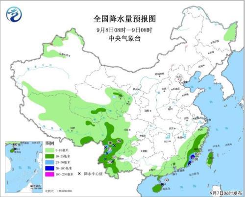 圖1 全國降水量預(yù)報圖(9月7日08時-8日08時)