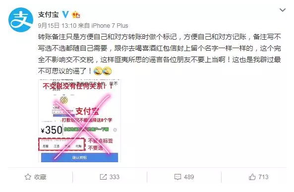 9月15日,“@支付寶”官方微博對(duì)此辟謠稱:轉(zhuǎn)賬備注只是方便自己和對(duì)方轉(zhuǎn)賬時(shí)做個(gè)標(biāo)記,方便自己和對(duì)方記賬,備注寫不寫選不選都隨自己需要,跟你去喝喜酒紅包信封上留個(gè)名字一樣一樣的,這個(gè)完全不影響交不交稅。