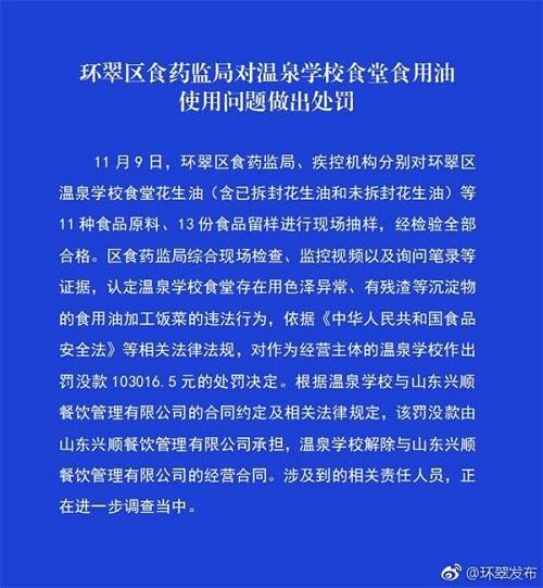 人民網(wǎng)濟南11月13日電(翟晨曦)13日,山東省威海市環(huán)翠區(qū)人民政府新聞辦公室官方微博@環(huán)翠發(fā)布發(fā)布微博,環(huán)翠區(qū)食藥監(jiān)局對溫泉學(xué)校食堂食用油使用問題做出處罰。