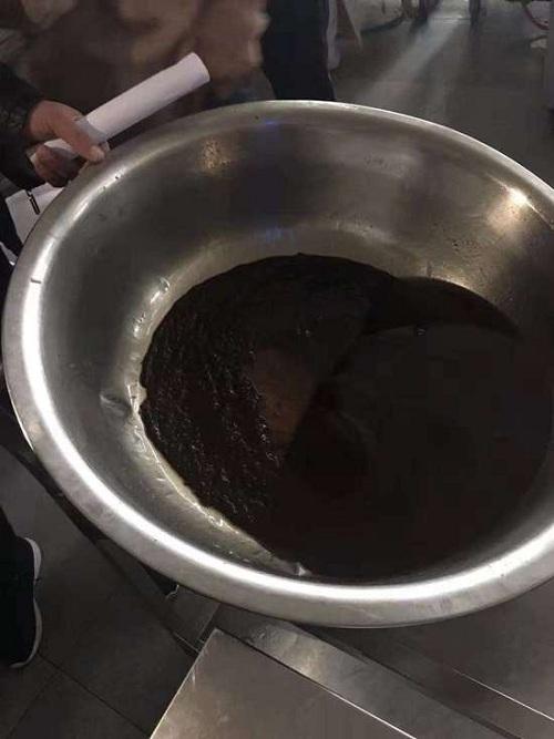 面盆內(nèi)疑盛放黑色食用油,盆底有沉淀物。 學(xué)生家長供圖
