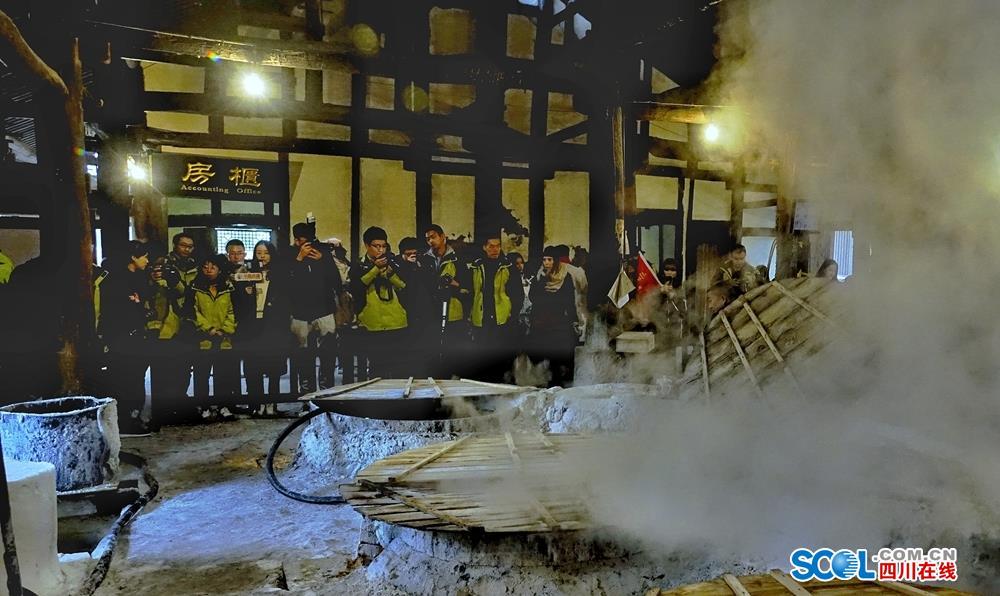 “千年鹽都”得源于自貢悠久的井鹽生產(chǎn)歷史,早在2000年以前,這里就以打井的方式抽取地下鹵水,通過汲鹵、輸鹵到用鐵鍋進(jìn)行煎鹽,從而制作成成品鹽。燊海井坐落于自貢大安區(qū)阮家壩山下,開鑿于清代道光十五年(公元1835年),是當(dāng)時(shí)世界上第一口超千米(1001.42米)深鹽井,至今仍保留著用大鐵鍋土法熬制井鹽的千年傳統(tǒng)手工制鹽技藝。據(jù)介紹,燊海井現(xiàn)有八口圓鍋煎鹽,每日產(chǎn)量仍保持在兩噸左右。