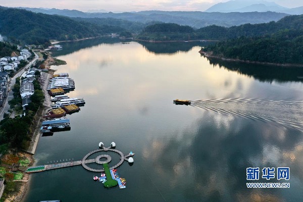 福建省泰寧縣大金湖畔的梅口鄉(xiāng)水際村及游客碼頭(11月19日攝,無人機(jī)照片)。新華社記者 姜克紅 攝