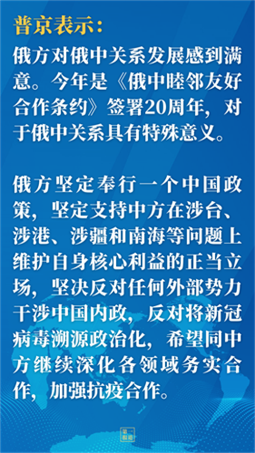 普京表示,俄方對(duì)俄中關(guān)系發(fā)展感到滿意。今年是《俄中睦鄰友好合作條約》簽署20周年,對(duì)于俄中關(guān)系具有特殊意義。76年前,俄中為取得世界反法西斯戰(zhàn)爭(zhēng)勝利付出巨大民族犧牲、作出決定性貢獻(xiàn)。當(dāng)前形勢(shì)下,雙方應(yīng)該密切戰(zhàn)略協(xié)作,相互堅(jiān)定支持,捍衛(wèi)二戰(zhàn)勝利成果,維護(hù)歷史真相。俄方堅(jiān)定奉行一個(gè)中國(guó)政策,堅(jiān)定支持中方在涉臺(tái)、涉港、涉疆和南海等問(wèn)題上維護(hù)自身核心利益的正當(dāng)立場(chǎng),堅(jiān)決反對(duì)任何外部勢(shì)力干涉中國(guó)內(nèi)政,反對(duì)將新冠病毒溯源政治化,希望同中方繼續(xù)深化各領(lǐng)域務(wù)實(shí)合作,加強(qiáng)抗疫合作。