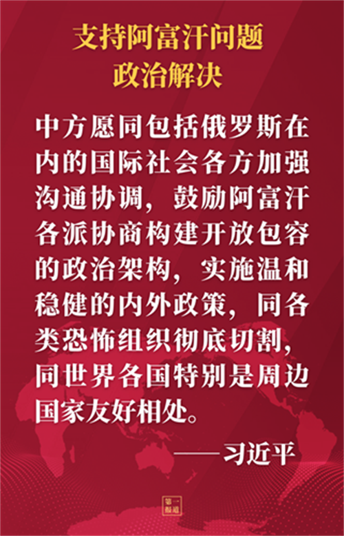 習(xí)近平強(qiáng)調(diào),中方尊重阿富汗的主權(quán)、獨(dú)立、領(lǐng)土完整,奉行不干涉阿內(nèi)政的政策,一直為政治解決阿富汗問(wèn)題發(fā)揮建設(shè)性作用。中方愿同包括俄羅斯在內(nèi)的國(guó)際社會(huì)各方加強(qiáng)溝通協(xié)調(diào),鼓勵(lì)阿富汗各派協(xié)商構(gòu)建開(kāi)放包容的政治架構(gòu),實(shí)施溫和穩(wěn)健的內(nèi)外政策,同各類(lèi)恐怖組織徹底切割,同世界各國(guó)特別是周邊國(guó)家友好相處。
