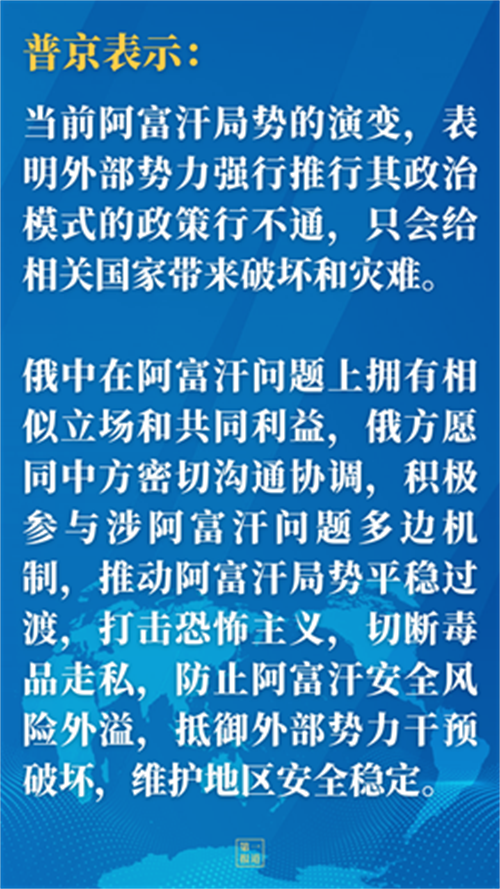 普京表示,當(dāng)前阿富汗局勢(shì)的演變,表明外部勢(shì)力強(qiáng)行推行其政治模式的政策行不通,只會(huì)給相關(guān)國(guó)家?guī)?lái)破壞和災(zāi)難。俄中在阿富汗問(wèn)題上擁有相似立場(chǎng)和共同利益,俄方愿同中方密切溝通協(xié)調(diào),積極參與涉阿富汗問(wèn)題多邊機(jī)制,推動(dòng)阿富汗局勢(shì)平穩(wěn)過(guò)渡,打擊恐怖主義,切斷毒品走私,防止阿富汗安全風(fēng)險(xiǎn)外溢,抵御外部勢(shì)力干預(yù)破壞,維護(hù)地區(qū)安全穩(wěn)定。