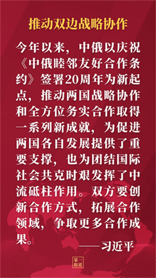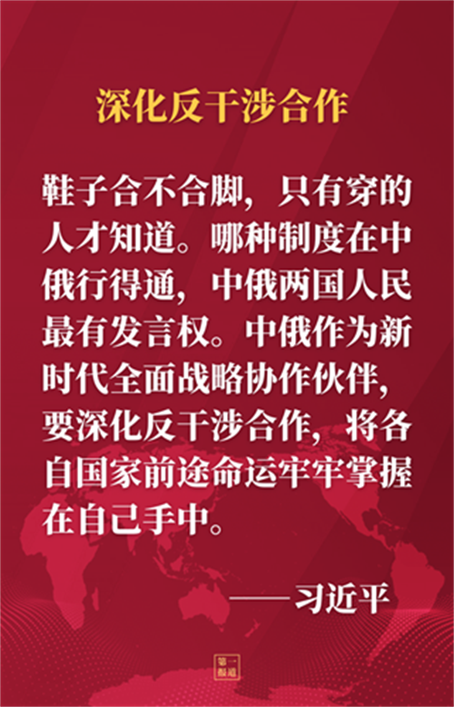 習(xí)近平強(qiáng)調(diào),鞋子合不合腳,只有穿的人才知道。哪種制度在中俄行得通,中俄兩國(guó)人民最有發(fā)言權(quán)。中俄作為新時(shí)代全面戰(zhàn)略協(xié)作伙伴,要深化反干涉合作,將各自國(guó)家前途命運(yùn)牢牢掌握在自己手中。中方堅(jiān)定支持俄羅斯走符合本國(guó)國(guó)情的發(fā)展道路,堅(jiān)定支持俄方為維護(hù)國(guó)家主權(quán)安全所采取的舉措。雙方要以今年上海合作組織成立20周年為契機(jī),同成員國(guó)一道,加強(qiáng)團(tuán)結(jié)協(xié)作,加大相互支持,維護(hù)地區(qū)國(guó)家安全和發(fā)展利益。