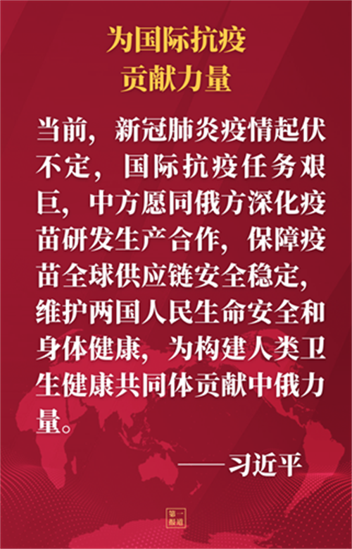 習(xí)近平指出,今年以來(lái),中俄以慶祝《中俄睦鄰友好合作條約》簽署20周年為新起點(diǎn),推動(dòng)兩國(guó)戰(zhàn)略協(xié)作和全方位務(wù)實(shí)合作取得一系列新成就,為促進(jìn)兩國(guó)各自發(fā)展提供了重要支撐,也為團(tuán)結(jié)國(guó)際社會(huì)共克時(shí)艱發(fā)揮了中流砥柱作用。雙方要?jiǎng)?chuàng)新合作方式,拓展合作領(lǐng)域,爭(zhēng)取更多合作成果。當(dāng)前,新冠肺炎疫情起伏不定,國(guó)際抗疫任務(wù)艱巨,中方愿同俄方深化疫苗研發(fā)生產(chǎn)合作,保障疫苗全球供應(yīng)鏈安全穩(wěn)定,維護(hù)兩國(guó)人民生命安全和身體健康,為構(gòu)建人類(lèi)衛(wèi)生健康共同體貢獻(xiàn)中俄力量。