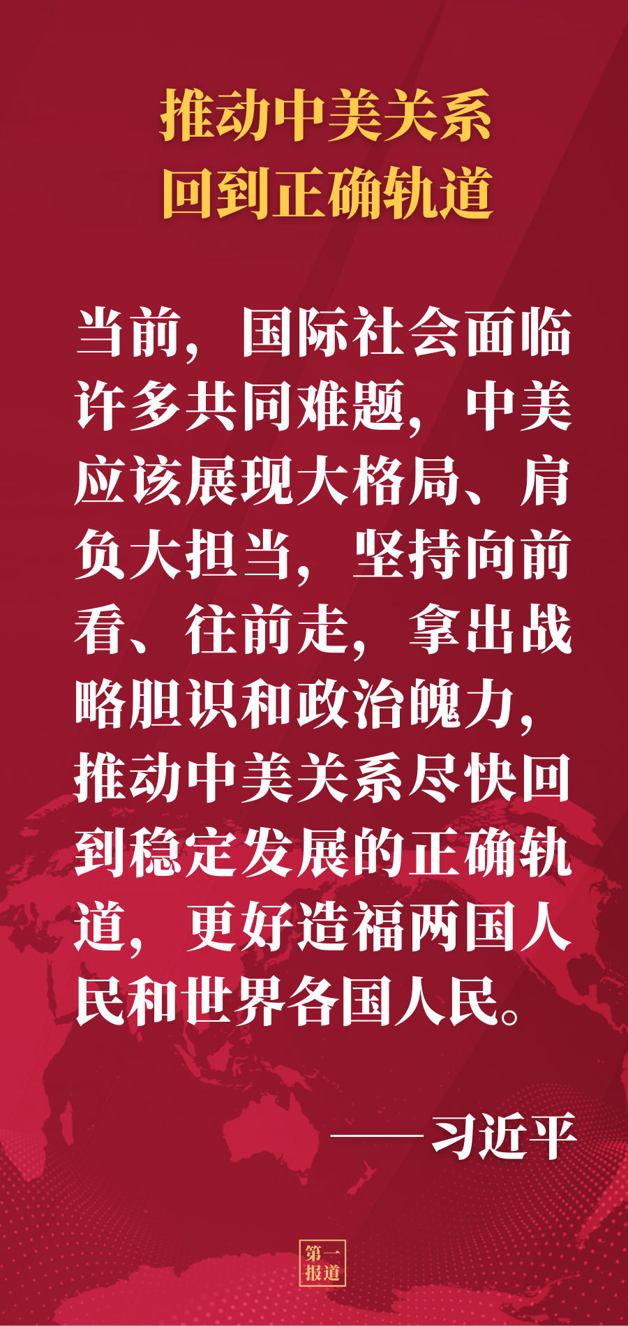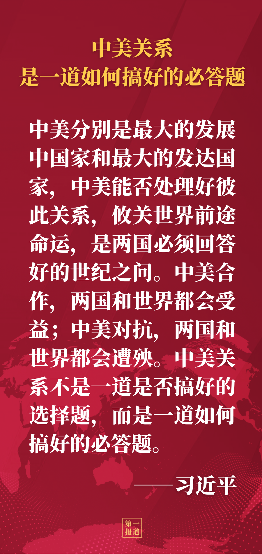 習近平指出,一段時間以來,美國采取的對華政策致使中美關(guān)系遭遇嚴重困難,這不符合兩國人民根本利益和世界各國共同利益。中美分別是最大的發(fā)展中國家和最大的發(fā)達國家,中美能否處理好彼此關(guān)系,攸關(guān)世界前途命運,是兩國必須回答好的世紀之問。中美合作,兩國和世界都會受益;中美對抗,兩國和世界都會遭殃。中美關(guān)系不是一道是否搞好的選擇題,而是一道如何搞好的必答題。