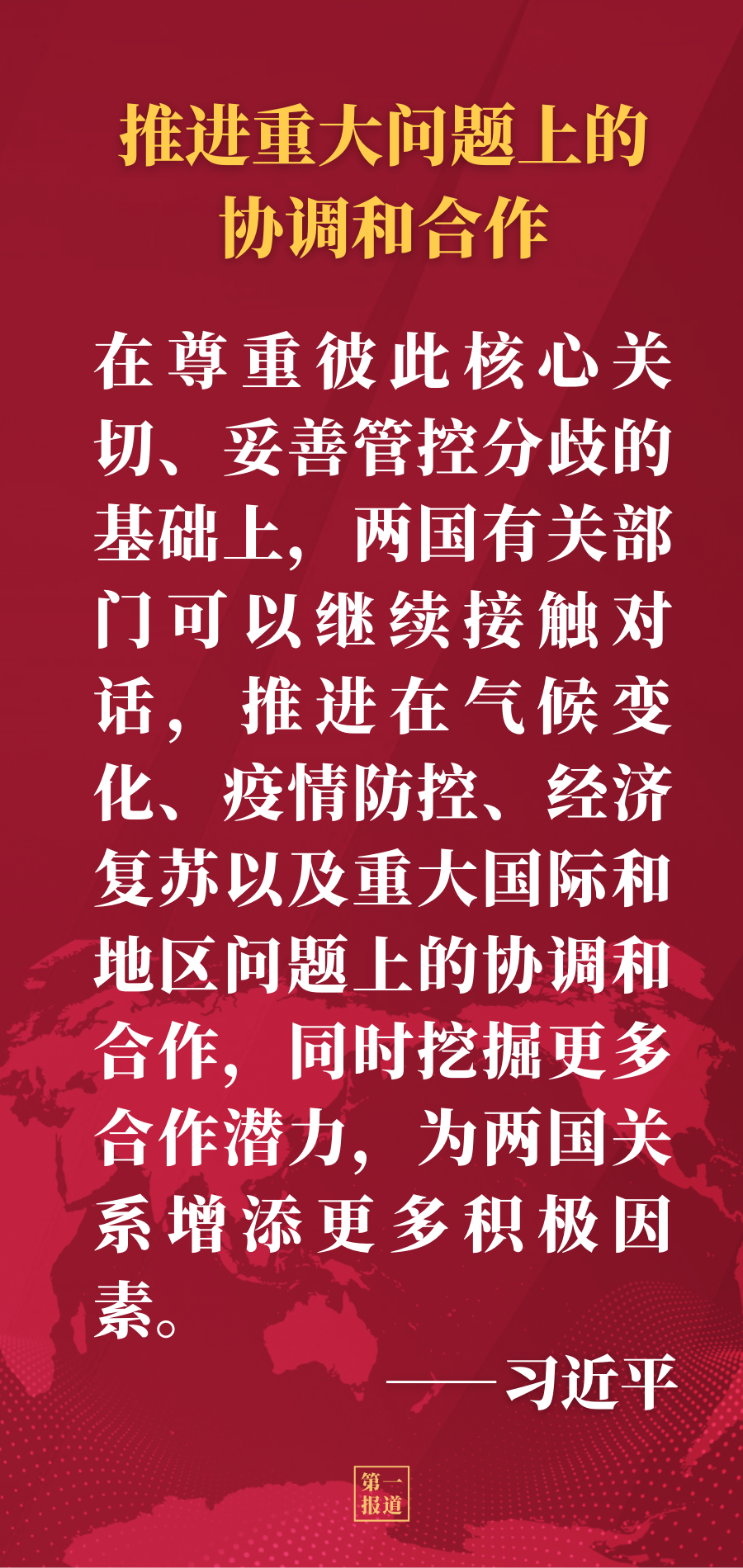習近平闡述了中方在氣候變化等問題上的立場,強調(diào)中方堅持生態(tài)優(yōu)先、走綠色低碳的發(fā)展道路,一直積極主動承擔同自身國情相符的國際責任。在尊重彼此核心關(guān)切、妥善管控分歧的基礎(chǔ)上,兩國有關(guān)部門可以繼續(xù)接觸對話,推進在氣候變化、疫情防控、經(jīng)濟復蘇以及重大國際和地區(qū)問題上的協(xié)調(diào)和合作,同時挖掘更多合作潛力,為兩國關(guān)系增添更多積極因素。