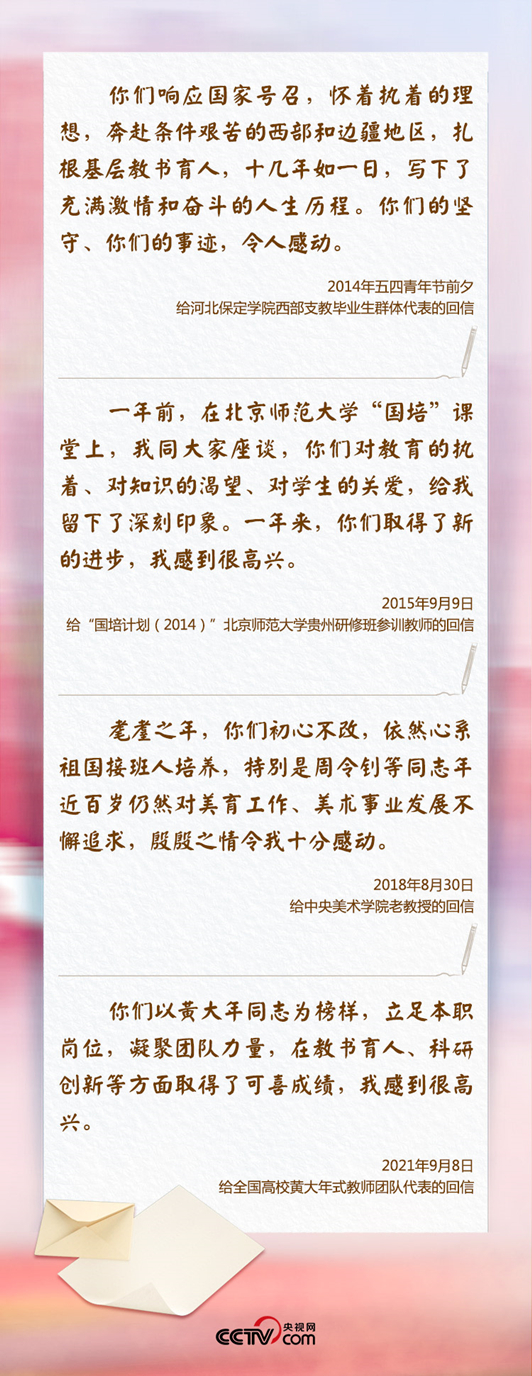近年來,習近平總書記給不少教師回過信,有曾經(jīng)面對面座談的研修班參訓教師,有耄耋之年依然心系祖國接班人培養(yǎng)的老教授,也有自愿到祖國西部支教的畢業(yè)生群體代表……