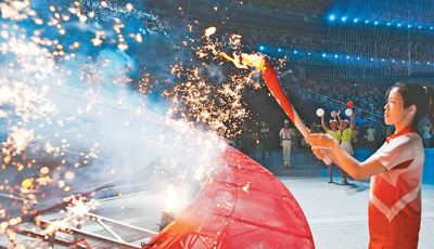開幕式火炬手楊倩點燃第十四屆全運會主火炬。新華社記者 彭子洋攝