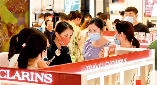 ▲ 2021年10月1日,游客在中免集團(tuán) ?谌赵聫V場(chǎng)免稅店采購免稅品 楊冠宇攝