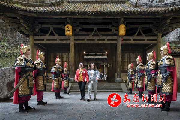 “女王駕到”“恭迎女王陛下”“諸位請(qǐng)起,游玩到此,觀景甚美,諸位與我,共享此景。”在天生三橋景區(qū)天福官驛客棧,一群身形魁梧的帶刀侍衛(wèi),整齊地站在驛站門口兩側(cè)恭迎每位入園的“女王”,F(xiàn)場(chǎng)儀式感爆棚,一身金黃的“女王”霸氣外露。驛站內(nèi)熱鬧的氛圍吸引了眾多游客參與,有的上前與侍衛(wèi)互動(dòng)拍照,有的主動(dòng)穿上“女王”服體驗(yàn)霸氣女王范,有的還主動(dòng)表演起了電影里女王翻牌的有趣橋段。“今天我最大,這樣過節(jié)著實(shí)過癮”玩得正起勁的劉女士表示,這是她過得最好玩、最具儀式感的女王節(jié)。
