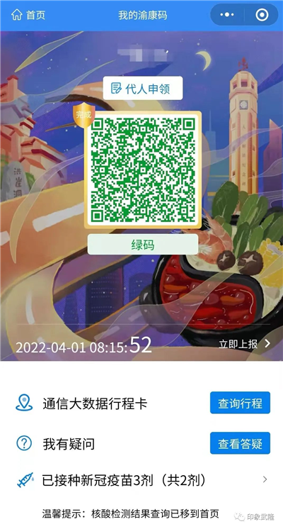 渝康碼:微信小程序——重慶健康出行一碼通——我的渝康碼——顯示綠碼即可