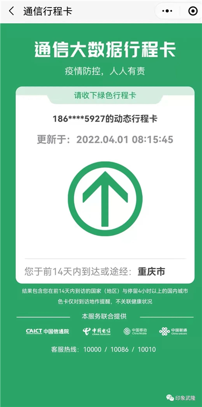 行程碼:微信小程序——行程卡——確認(rèn)授權(quán)運(yùn)營商查詢行程信息——填寫手機(jī)號和驗(yàn)證碼——點(diǎn)擊查詢——顯示綠碼即可