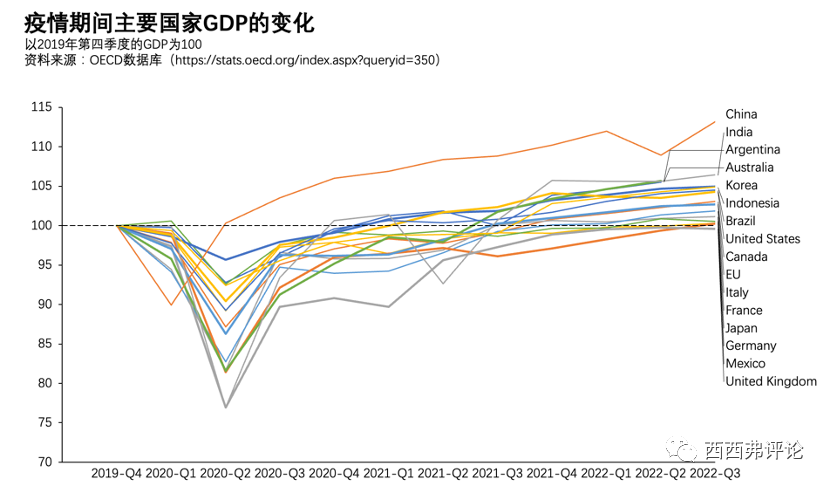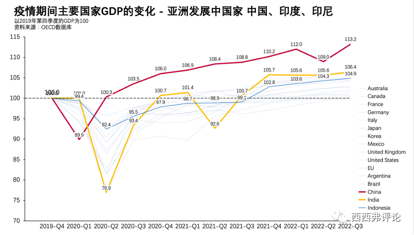 所以,看各國經(jīng)濟(jì),得以疫情前的數(shù)據(jù)作為基準(zhǔn)。最近OECD數(shù)據(jù)庫更新了主要國家今年三季度的GDP增長數(shù)據(jù),印度的三季度數(shù)字也出來了。我根據(jù)這個,更新了一下最新的各國GDP,以2019年第四季度的GDP為100。
