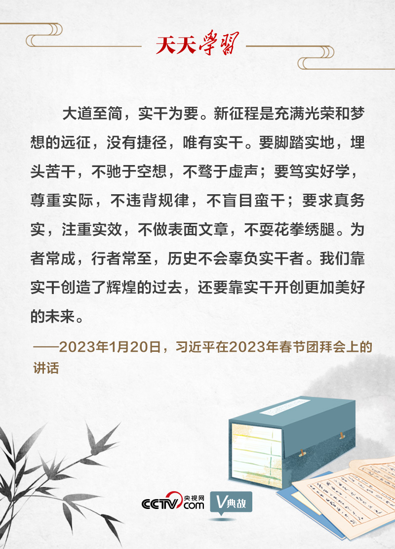 /天天學(xué)習(xí)/ 1月20日舉行的2023年春節(jié)團拜會上,習(xí)近平總書記指出,新征程是充滿光榮和夢想的遠征,沒有捷徑,唯有實干。他引用古語“為者常成,行者常至”,發(fā)出新春號召:歷史不會辜負實干者。我們靠實干創(chuàng)造了輝煌的過去,還要靠實干開創(chuàng)更加美好的未來。