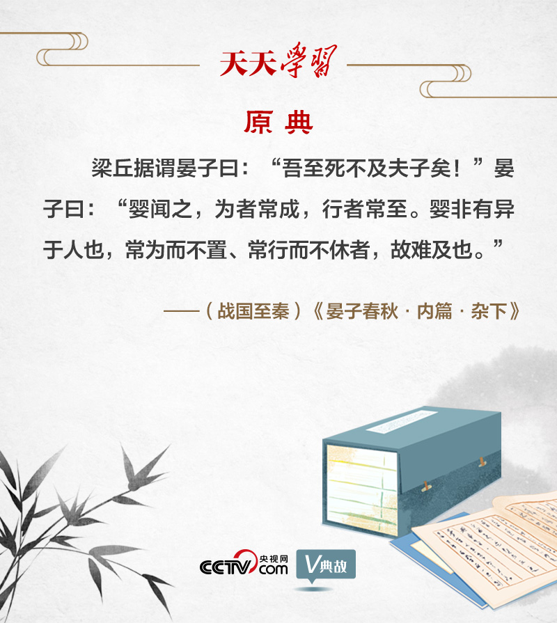 “為者常成,行者常至”,出自春秋時期齊相晏子與大夫梁丘據(jù)的一段對話。梁丘據(jù)與晏子既是朋友,也是政治對手。一次,他對晏子說:“我恐怕到死也趕不上先生您了!”晏子說:“我聽說,努力去做的人通常可以成功,不倦前行的人常?梢缘竭_目的地。我和別人比并沒有什么不同,只是經(jīng)常做個不停、走個不停罷了,所以很難被趕上。”