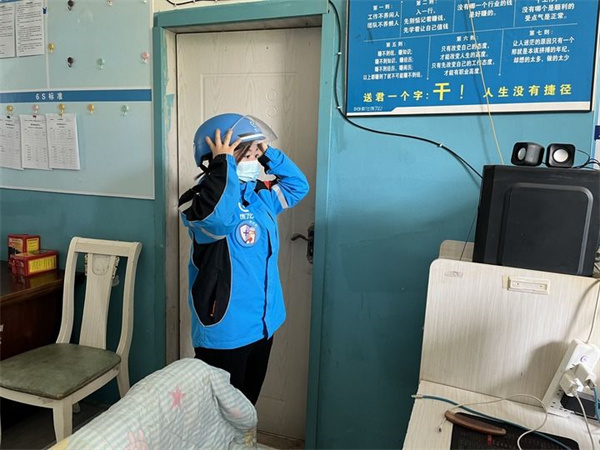 祖國(guó)大西北,寧夏銀川。4月29日下午4點(diǎn)半,外賣(mài)女騎手丁國(guó)梅麻利地穿起工服、戴上口罩、戴好頭盔,風(fēng)風(fēng)火火開(kāi)始了晚高峰送餐。
