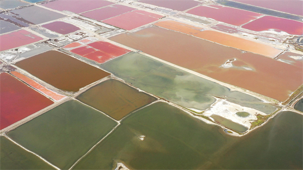△運(yùn)城鹽湖。夏季是鹽湖里微生物繁衍的旺盛期,不同的微生物使得鹽湖的不同池水呈現(xiàn)出不同的色彩,造就了七彩鹽湖的奇觀。(總臺(tái)記者裴大偉拍攝)