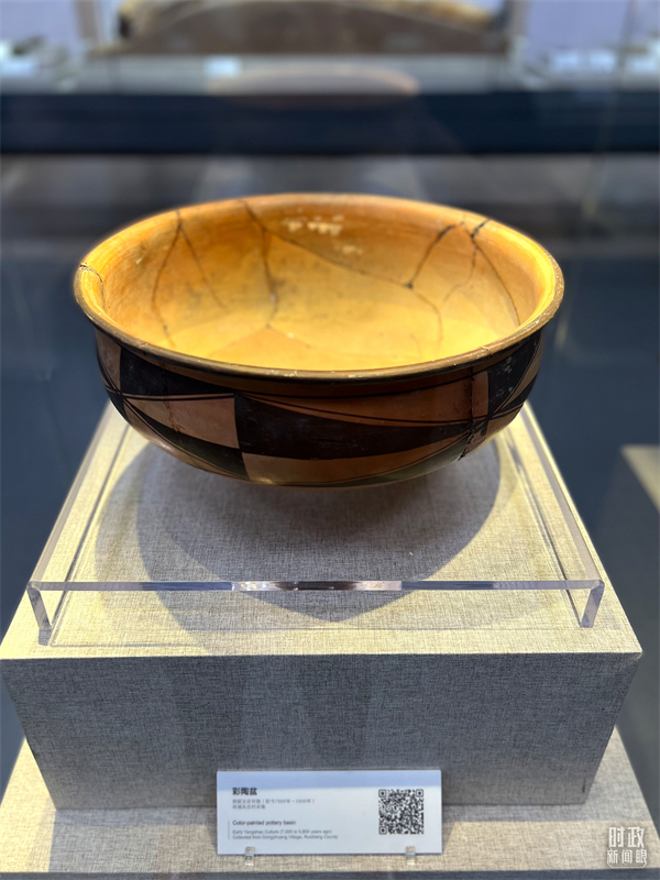 △運(yùn)城博物館內(nèi)展出的仰韶文化早期的彩陶盆。(總臺(tái)央視記者邢彬拍攝)