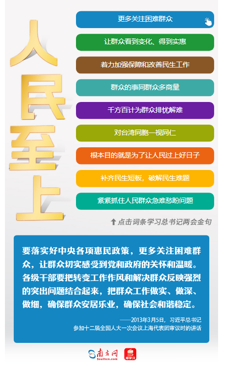 參加代表團(tuán)審議,習(xí)近平總書記常常跟代表們提及民生工作、民生保障、民生改善等話題。“人民”二字在他心中分量最重。正如他所說(shuō),“黨團(tuán)結(jié)帶領(lǐng)人民進(jìn)行革命、建設(shè)、改革,根本目的就是為了讓人民過(guò)上好日子,無(wú)論面臨多大挑戰(zhàn)和壓力,無(wú)論付出多大犧牲和代價(jià),這一點(diǎn)都始終不渝、毫不動(dòng)搖。”