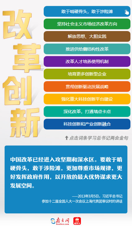 經(jīng)濟(jì)體制改革、供給側(cè)結(jié)構(gòu)性改革、農(nóng)村改革……習(xí)近平總書記參加代表團(tuán)審議時(shí)多次提及改革,強(qiáng)調(diào)要解放思想、勇于突破、當(dāng)好標(biāo)桿,對(duì)照最高標(biāo)準(zhǔn)、查找短板弱項(xiàng),大膽試、大膽闖、自主改。