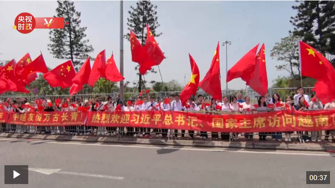 習(xí)近平乘車(chē)從機(jī)場(chǎng)赴下榻飯店途中,中越兩黨兩國(guó)旗幟迎風(fēng)飄揚(yáng),“中越友誼萬(wàn)古長(zhǎng)青”、“山水相連,命運(yùn)與共”、“中越情誼深,同志加兄弟”等紅色橫幅鮮艷奪目。當(dāng)?shù)孛癖姾椭匈Y機(jī)構(gòu)、留學(xué)生代表聚集在道路兩旁,熱烈歡迎習(xí)近平到訪。