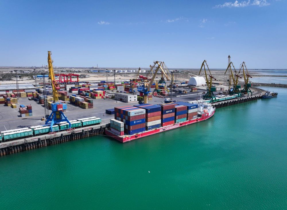 8月6日,一艘貨輪?吭诠_克斯坦阿克套港(無人機(jī)照片)。新華社記者 李任滋 攝