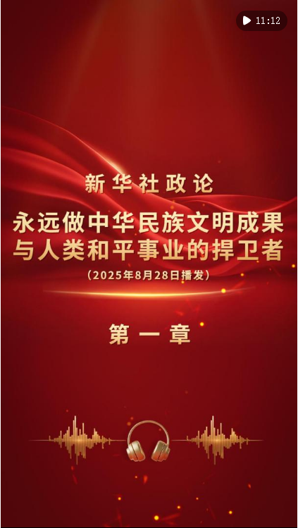 新華社8月28日播發(fā)《新華社政論|永遠做中華民族文明成果與人類和平事業(yè)的捍衛(wèi)者——寫在中國人民抗日戰(zhàn)爭暨世界反法西斯戰(zhàn)爭勝利80周年之際》。我們邀請誦讀嘉賓任志宏演播“第一章”。aLH安康新聞網(wǎng)