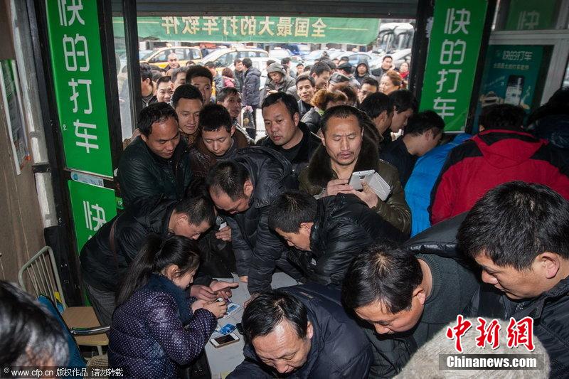2014年2月19日,杭州“快的打車”服務(wù)點,出租車司機(jī)們排隊安裝軟件。圖片來源:CFP視覺中國