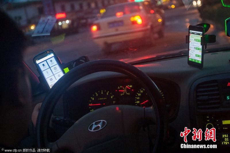 2014年2月19日,杭州,一位出租車司機(jī)同時(shí)開(kāi)著兩款打車軟件。圖片來(lái)源:CFP視覺(jué)中國(guó)5kE安康新聞網(wǎng)