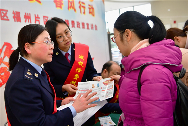 國家稅務(wù)總局福州經(jīng)濟(jì)技術(shù)開發(fā)區(qū)稅務(wù)局工作人員,在馬尾區(qū)“減稅降費(fèi) 春風(fēng)行動(dòng)”宣講活動(dòng)現(xiàn)場為一家企業(yè)的出納(右一)講解稅收優(yōu)惠政策(2月25日攝)。 新華社……